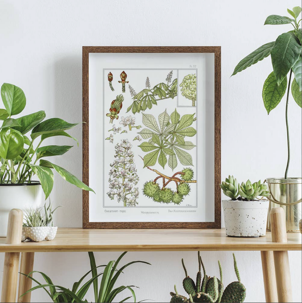 A beautiful print of chestnut leaves and conkers, in green tones.