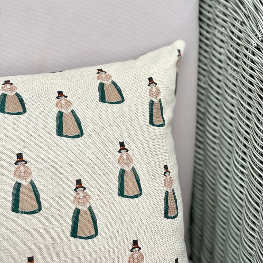Designed and made by us in our studio in Carmarthenshire, each cushion incorporates our charming illustration of a Welsh lady in traditional dress, printed onto 100% organic cotton.