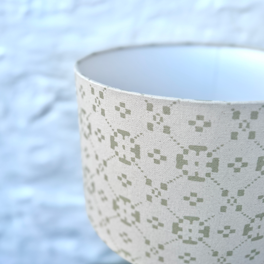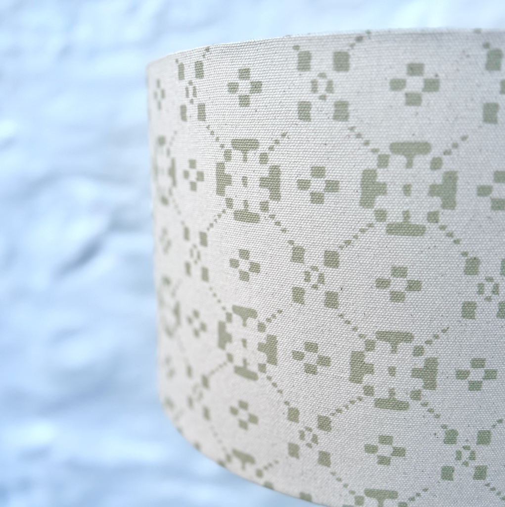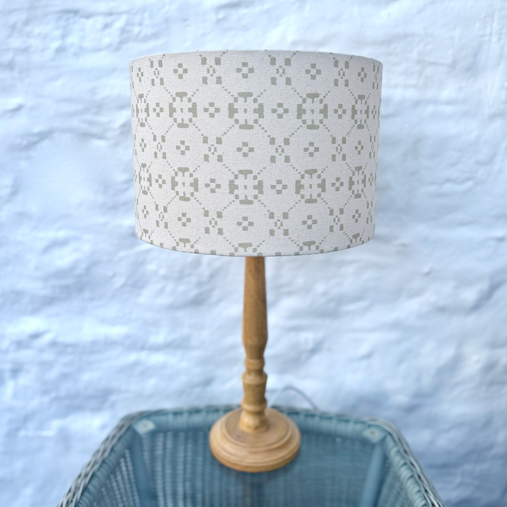 This beautiful organic cotton lampshade is designed by us in Carmarthenshire and handmade nearby in South Wales. It incorporates our own Llandeilo Welsh tapestry pattern.