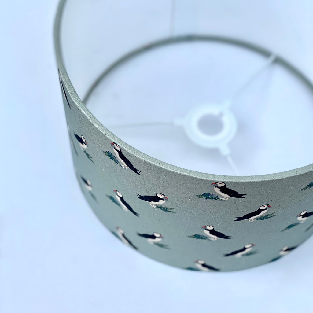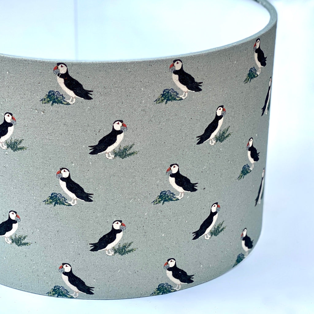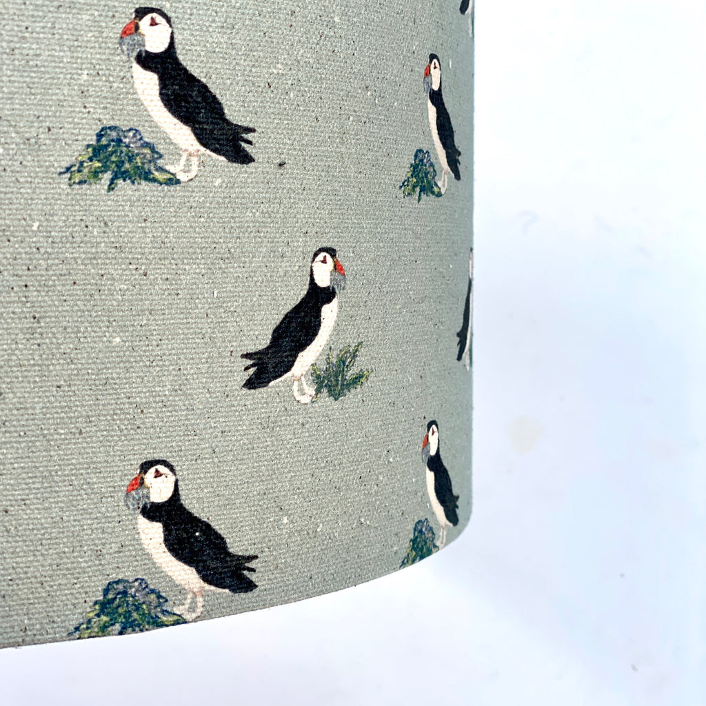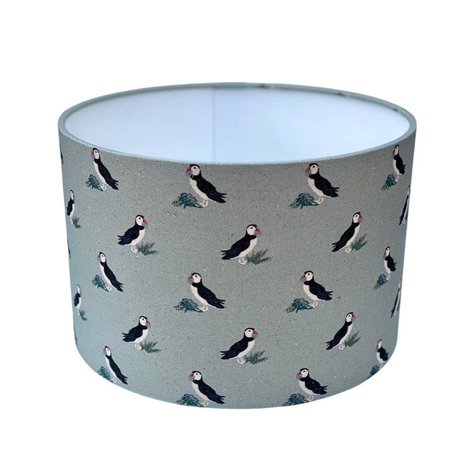 Our beautiful puffin print lampshade is designed by us and handmade in South Wales. It incorporates our striking hand drawn illustration of a pretty puffin, a bird found near the Pembrokeshire coast in the spring and summer.